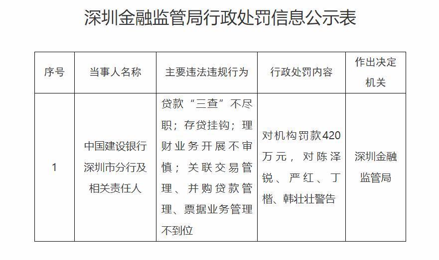据处罚公告显示,中国建设银行深圳市分行因存在多项严重违规操作,被处以420万元人民币的罚款,同时该行四名相关责任人也因管理失职受到警告处分。这一处罚力度在近期金融监管案例中较为突出,凸显了监管部门对金融机构合规经营的高度重视。