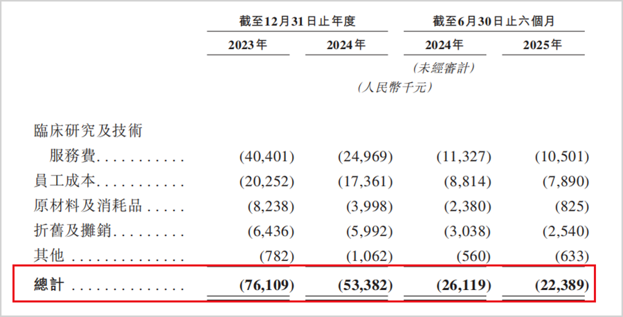 更值得关注的是,作为一家需要长期高强度投入的Biotech公司,时迈药业的研发投入近年来呈现显著收缩趋势。报告期内,研发费用从2023年的0.76亿元降至2024年的0.53亿元,2025年上半年进一步缩减至0.22亿元,同比降幅超15%。