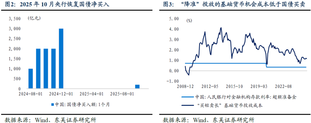 国债买卖或成为“降准”的有效补充。2018年货币政策进入较长的“降准”周期,加权平均法定存款准备金率也从2018年的14.90%直降至2025年的6.20%,未来“降准”空间愈加逼仄,为呵护长期流动性宽松,2024年央行启用公开市场国债买卖来作为投放基础货币的有效补充,尽管2025年1月至9月由于债券市场供需失衡而阶段性暂停,但是2025年10月,人民银行恢复公开市场国债买卖操作。从基础货币投放期限上看,国债买卖即便以最短期限1-3年期来看,也超过当前流动性期限结构中的MLF等工具,单就基础货币投放期限来看,国债买卖提供的更多是“长期流动性”,并且与“降准”等需要透过银行体系的资产负债行为产生效应相比,国债买卖的“政策主动性”更强,在与更加积极的财政政策协同发力上更具优势,2026年公开市场国债买卖或将常态化操作,如果央行在公开市场操作上净买入1万亿元国债,那么其流动性投放规模等同于一次50bps的“降准”。从基础货币操作成本来看,仍然以超额存款准备金利率作为“降准”的机会成本,截至2025年11月“降准”的机会成本依旧为35bps;如果国债买卖以“2倍买短、1倍卖长”作为基准操作,那么截至2025年10月底,“2倍买入2年期、1倍卖出7年期”所投放的基础货币成本则为116bps;如果国债买卖仅净买入短期国债,截至2025年10月末,2年期国债利率均值为1.43%。从静态成本来看,“降准”依旧是投放成本较低的基础货币供给。