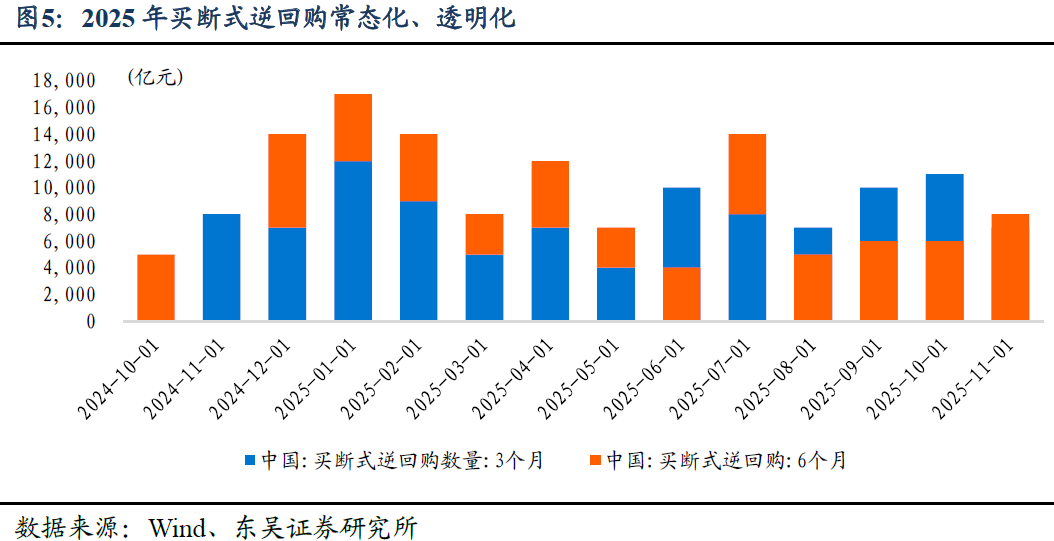 从中期和短中期流动性投放机制看,MLF进一步淡化政策利率属性、流动性操作规则化。2025年中期借贷便利(MLF)招投标模式调整为“固定数量、利率招标、多重价位中标”,在MLF操作利率的政策属性褪色之后,保留了投放中期流动性的调节功能,截至2025年11月17日,年初以来MLF累计投放9,610亿元,占基础货币余额的比例从年初的11%提升至10月末的16%。与MLF招投标模式相同的买断式逆回购今年以来也成为流动性的主要投放方式,并且今年以来基本形成每月5日前后开展3个月买断式逆回购、15日前后开展6个月买断式逆回购、25日开展1年期MLF的中长期资金投放模式。中期和短中期流动性投放更加透明和规则化,有利于稳定资金利率预期。