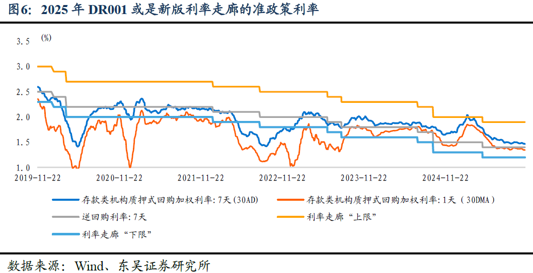 准政策利率从DR007切换至DR001、“利率走廊”形态正在重构。2024年下半年央行创设临时性逆回购和临时性正回购,操作基准分别是在锚定7天期逆回购操作利率的基础上减点20bps和加点50bps,操作的流动性期限是“固定利率、数量招标”的隔夜,从2024年6月至2025年8月是新旧利率走廊并存的时期,但是2025年8月央行在第二季度货币政策执行报告中删除了“常备借贷便利发挥利率走廊上限作用”这一表述,且在今年以来的三份货币政策执行报告中,均将DR001作为代表性利率开宗明义,意味着2025年8月份开始,新版“利率走廊”是引导DR001围绕7天期逆回购操作利率波动、走廊上下限为临时性正逆回购操作利率框定的70bps范围。