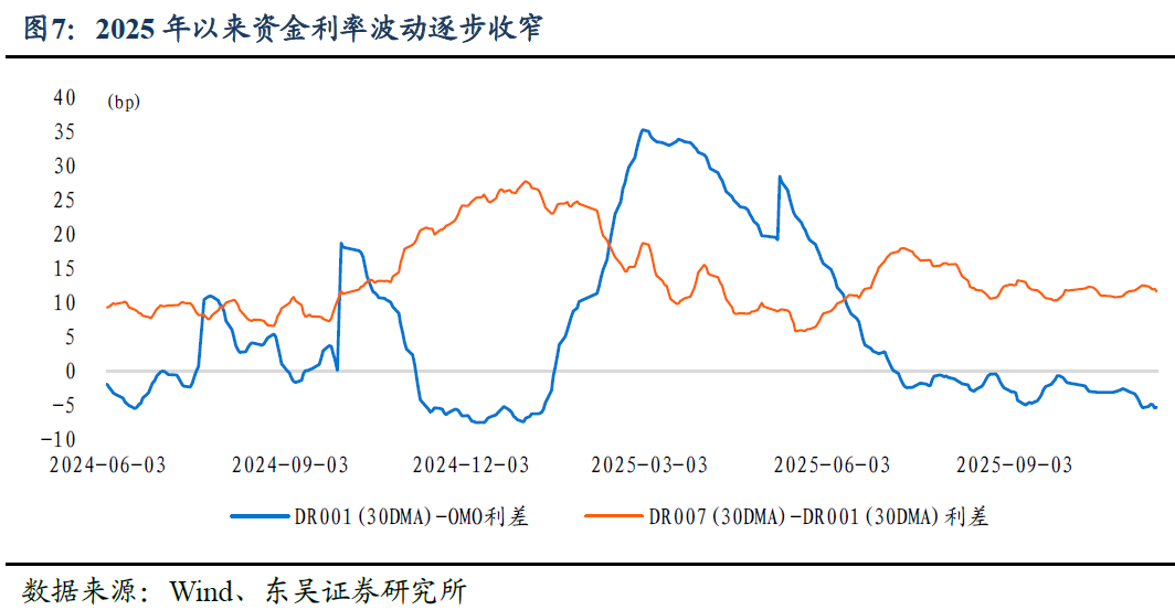 之所以准政策利率期限从DR007切换至DR001,主要原因或是相比DR007,隔夜回购利率的可控性和可测性更强,导致其基准性也就更高。2025年以来,随着逆回购、买断式逆回购和MLF等多种流动性调节机制的共同作用,资金利率波动率正在逐步收窄,DR007和DR001之间利差基本稳定在11bps,而DR001和7天期逆回购利率之间稳定在-5bps左右。根据2025年10月底人民银行在“十五五”规划辅导读本刊文指出将“不断增强央行政策利率的作用,收窄短期利率走廊的宽度,进一步畅通由央行政策利率向市场基准利率,再到各种金融市场利率的传导”,或意味着基于临时性正逆回购框定的利率走廊上下限均有继续调整的空间。