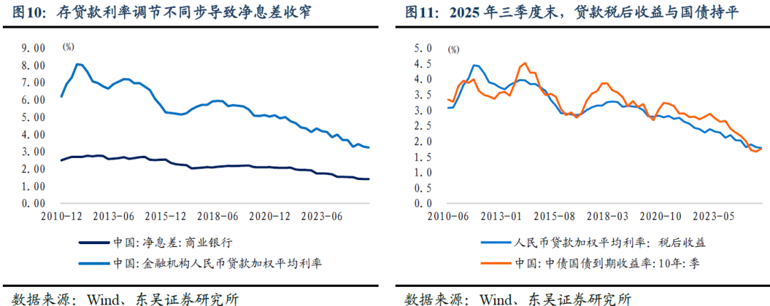 存贷款定价周期分离导致银行净息差持续压缩。2022年迄今的“降息”周期内,银行净息差持续压缩的重要原因是存款和贷款定价周期不同,存款利率下行幅度和节奏弱于贷款利率:从资产端来看,以2022年一季度作为起点来看,截至2025年三季度末,在“降息”作用下,1年期LPR报价累计下调70bps,5年期LPR报价下调110bps,但是金融机构发放的人民币贷款加权平均利率降幅达到141bps,其中个人住房贷款利率累计下降243bps,实际投放贷款利率比贷款基准降幅更高,实际上在持续压缩信用溢价和期限溢价;从负债端来看,尽管2022年以后构建起存款利率根据“1年期LPR+10年期国债利率”调整的传导机制,在1年期LPR报价合计下调70bps的情况下,国有大行活期存款降幅仅有20bps,2022年至2023年新增定期存款主力期限3年期定存利率降幅则为135bps。总体上看,存款利率降幅低于贷款利率降幅,持续压缩的净息差也影响了货币政策传导效率。2024年起,央行强化贷款和存款自律机制执行,通过治理资金空转约束银行负债端“内卷式”竞争;2025年开始,央行通过治理贷款“内卷式”竞争,指引修复贷款溢价过低、信用溢价和期限溢价持续压缩的局面。治理“内卷式”竞争或导致银行资产和负债两端进行风险重定价,贷款利率相比无风险利率进一步压缩溢价的空间有限。