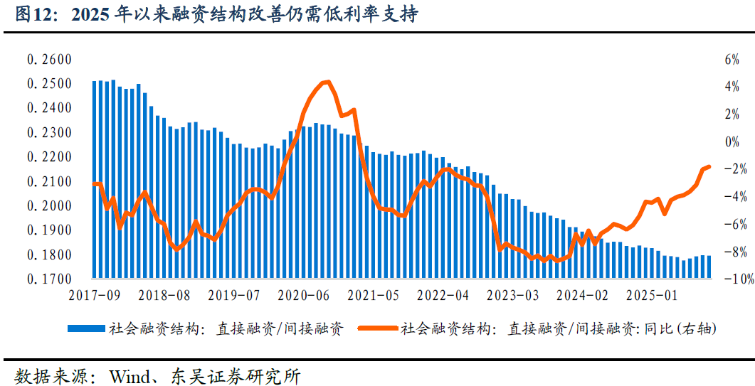 2025年1月-10月虽然非金融企业部门直接融资需求有所恢复,但是经济仍面临有效融资需求仍然不足的问题,以社会融资规模结构中的“非金融企业股票融资+企业债券+未贴现银行承兑汇票”作为直接融资的指标,与贷款融资的相对比例进入2025年后出现稳定的迹象,可依旧没有止住同比增速下滑的状态,截至2025年10月末直接融资/间接融资比值稳定于17.95%,同比跌幅收窄至1.84%,相比去年同期的6.08%已经大幅改善。直接融资相对间接融资收缩,表明当前制约融资增长的主要矛盾是需求约束,金融体系供给的流动性总量充裕,但受限于融资需求低迷,形成“融资成本下行、直接融资相比间接融资收缩”的局面,因此当前稳定有效融资需求仍然需要适时“降息”以及保持低利率状态。