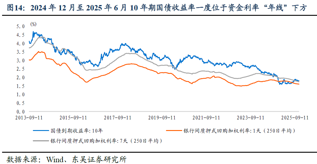 (2)DR007“年线”或继续是10年期国债收益率重要的“估值锚”。2024年12月至2025年年中,在利率透支了“适度宽松”的预期期间,10年期利率不仅击穿了DR007的250日均线,而且在较长时间里处于DR007的“年线”下方运行,彼时10年期国债收益率一个隐形的走廊初现雏形,然而在2025年7月大宗商品“反内卷”政策将“再通胀”预期摆在交易台上之后,10年期利率重新回到DR007的“年线”之上,截至2025年11月17日,DR007的250日均线位于1.74%,10年期国债收益率仍然贴近资金利率“年线”运行,并且从2013年以来,DR007的“年线”构成10年期国债收益率运行的长期锚定。