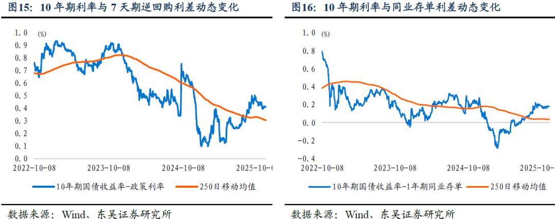 宏观经济共识增强、利率驱动因素简化。从市场广泛接受的利率定价框架看,经过2024年至2025年的演化,利率对宏观经济与政策的共识在增强,利率能吃的“面”范围在缩小:(1)“基本面”共识在增强,GDP增速趋于稳定,在经济增长动能新旧切换的时期,房地产这一传统的信用扩张机制减弱,但“新质生产力”还未成为推动信用扩张的主力,“轻质资产行业”对贷款的融资需求弱于房地产等重资产行业,当每年度GDP增速趋于收敛,经济增长层面推动利率趋势性上行或下行的空间在收窄,我们预计“十五五”期间宏观经济共识将继续巩固增强;(2)“政策面”共识在增强,如前文所述,“降准降息”的充分条件是“稳增长”,2024年至2025年总量宽松主要在“稳增长”诉求升温的时期落地,2025年前10个月,经济增长动能虽有边际减弱,但完成全年经济增长目标的概率较大,总量宽松仍在保留空间。2025年以来,利率对“降准降息”和重启国债买卖的反应理性且平静,折射出利率在“基本面”和“政策面”的共识在增强,此时驱动利率波动因素简化为“资金面”以及与之紧密联系的机构行为。