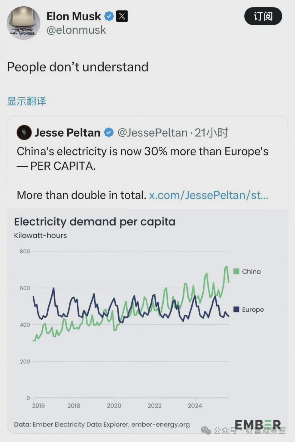 长期以来,欧美工业强国形象深入人心,但中国在电力领域的变革正改写全球能源格局。特斯拉创始人马斯克在社交媒体转发的一组数据引发震动:中国人均用电量较欧洲高出30%,总用电量达欧洲两倍以上。这一数据背后,是更震撼的现实图景——