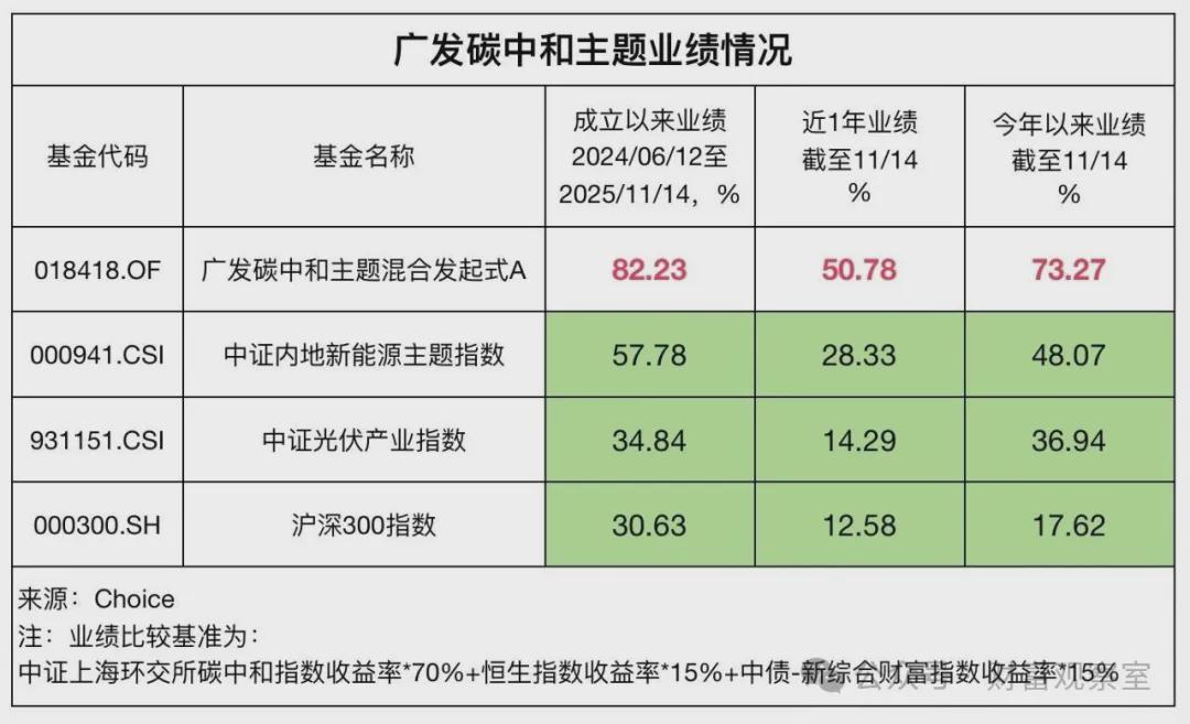 数据印证了这种策略的有效性:截至11月14日,该基金年内涨幅达73.27%,超越业绩基准43个百分点。与中证内地新能源主题指数、中证光伏产业指数相比,近1年、成立以来的超额收益均显著领先。