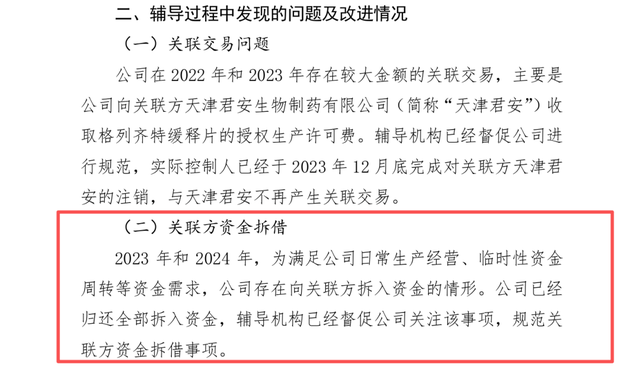 在这份落款时间为2025年11月12日的报告中,天风证券称在辅导过程中发现的问题之一即是有关延安医药与关联方的资金拆借。