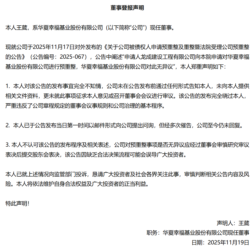 华夏幸福董事王葳发布登报声明,称对公司预重整相关公告的发布“完全不知情”,并指出该公告“严重违反了公司章程规定的董事会议事规则和公司治理的基本程序”。王葳明确表示,不认可该公告的发布程序及相关表述,并已就上述情况向监管部门投诉。
