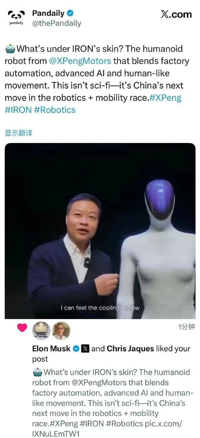 11月5日的小鹏科技日,几乎像一场科幻展。人形机器人IRON的登场,走起猫步轻盈流畅,逼真到网友集体质疑:“这里面是不是藏了人?”