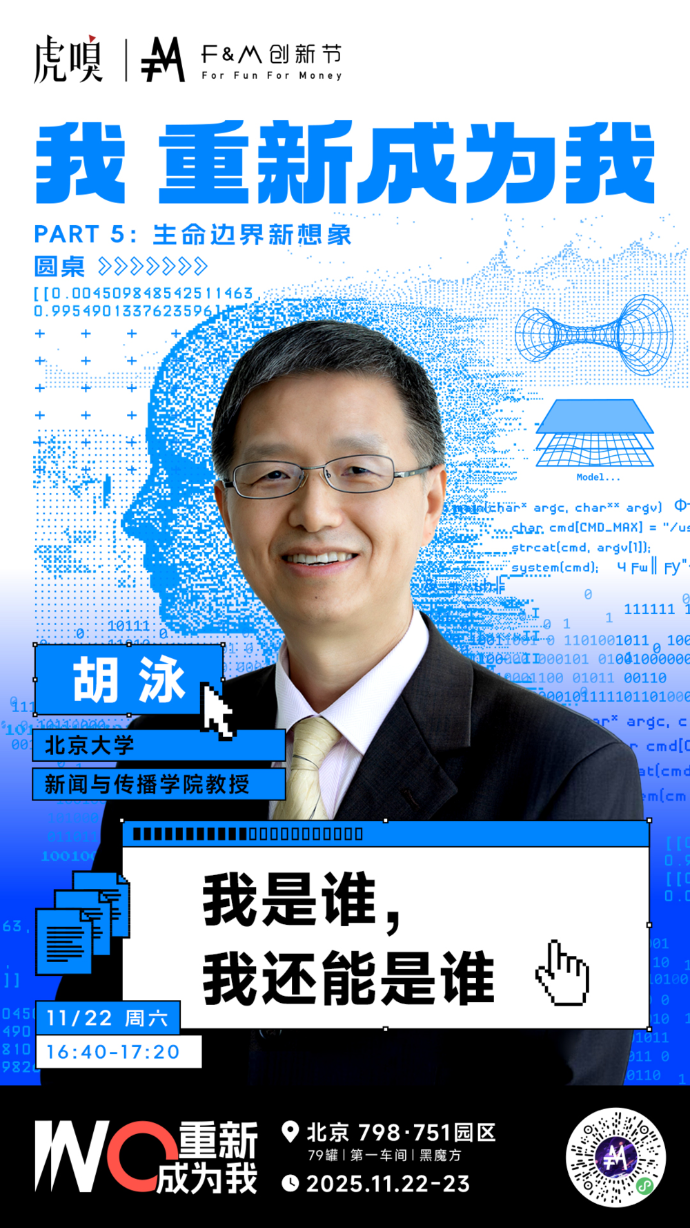 北京大学新闻与传播学院教授胡泳,将参与圆桌《我是谁,我还能是谁》的探讨。在AI不仅能模仿思维,更开始介入创造、情感乃至社会关系的今天,它挑战的已不仅仅是身份认同,更是“生命”本身的定义。胡泳将从传播与社会的视角出发,探讨在算法与肉体交融的时代,生命的边界与尊严何在。