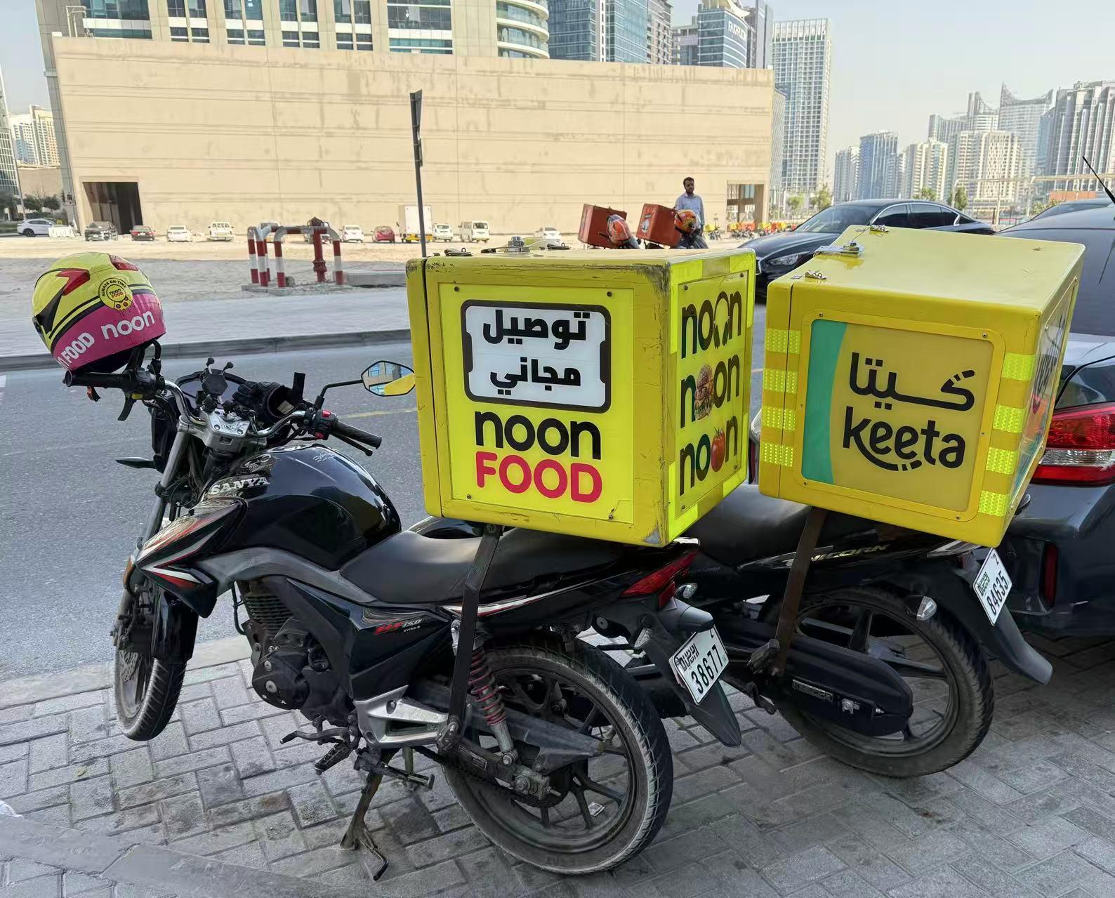 中午时分的迪拜核心商圈,街道两旁停放着挂满红、黄、蓝、绿各色外卖箱的摩托车,每个颜色背后都代表着一个试图在这片新兴市场站稳脚跟的外卖平台。尽管尚未实现“外卖自由”,但外卖服务正以独特的方式融入迪拜人的日常生活。