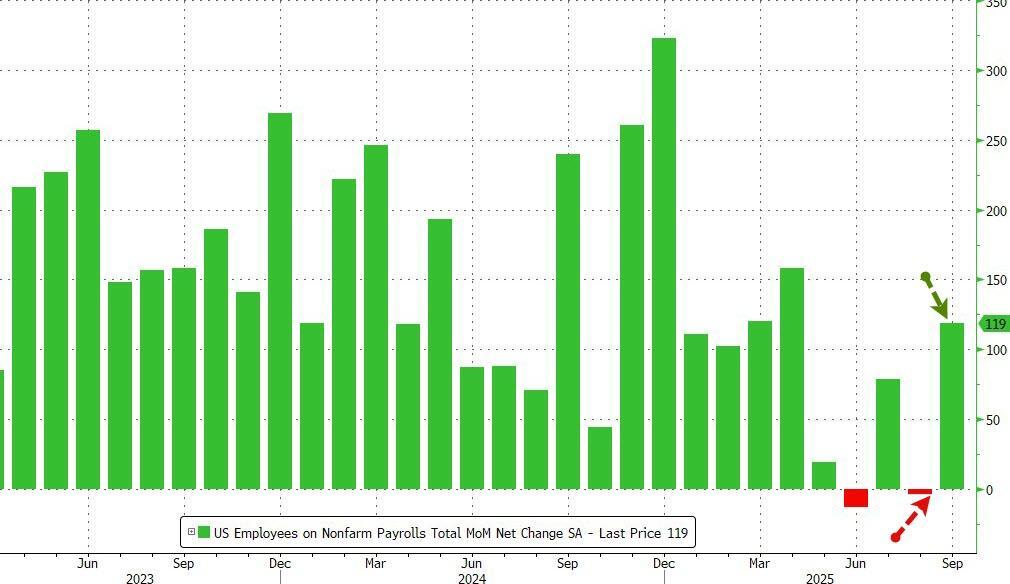 根据报告,美国9月非农就业人口增长11.9万人,是预期5.1万的两倍多。然而,8月份新增就业人数从增长2.2万人下修2.6万,至减少0.4万人,7月和8月非农就业人数合计下修3.3万人,延续了今年“持续向下修正”的模式。