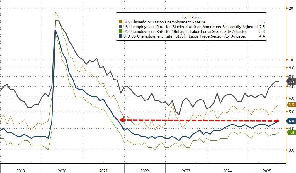 与此同时,平均时薪的月度增幅是自6月以来最小的。经济学家密切关注这一指标,因为它是家庭支出的关键驱动力,而在当前消费越来越分化的情况下,美国最富裕的人群贡献了近一半的总消费。