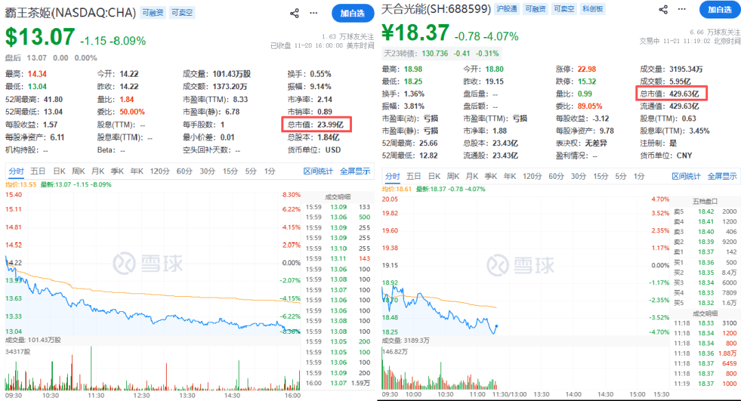 两家联姻并不简单,背后是两家上市公司:一个是在美股上市、市值24亿美元(约170亿人民币)的霸王茶姬,另一个是A股上市、市值431亿的天合光能。只能说,有钱人终成眷属啊~