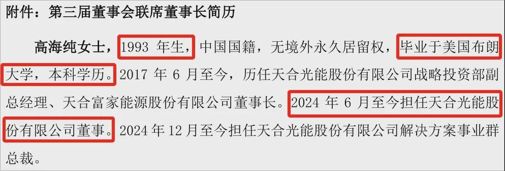 高海纯也因为她的美貌,大眼睛、高鼻子、尖下巴、肤白纤瘦,被称为“最美富二代”。并且今年她还接班天合光能,成为联席董事长。
