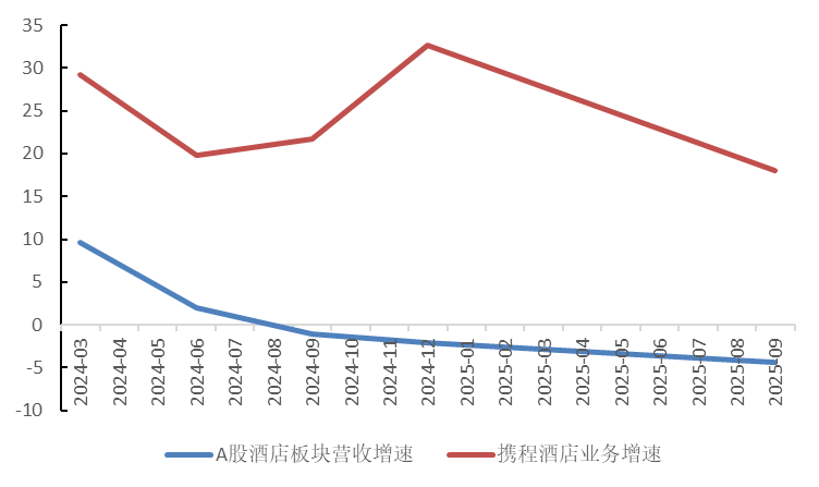 纵向比较来看,自2023年全面放开后至今,携程住宿预订业务的收入同比增速显著高于同期A股酒店板块的营收同比。这一对比,无疑揭示了携程在住宿预订业务上的强劲增长势头。