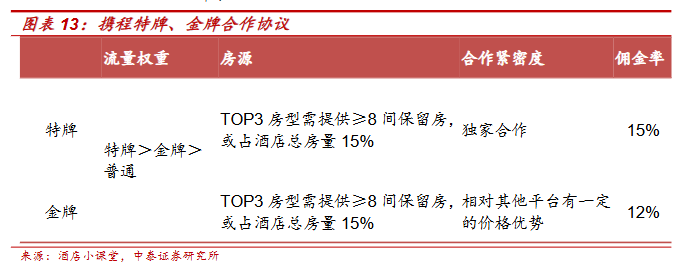 从抽成比例来看,携程对商家的抽佣比例跟所在细分行业和商家的议价能力有关。根据中泰证券研报,携程住宿预订业务综合佣金率在8%-10%左右;对于流量倾斜的特牌、金牌等佣金率更是高达12~15%。这一抽佣比例,无疑增加了酒店的运营成本,对酒店的盈利能力构成了一定压力。