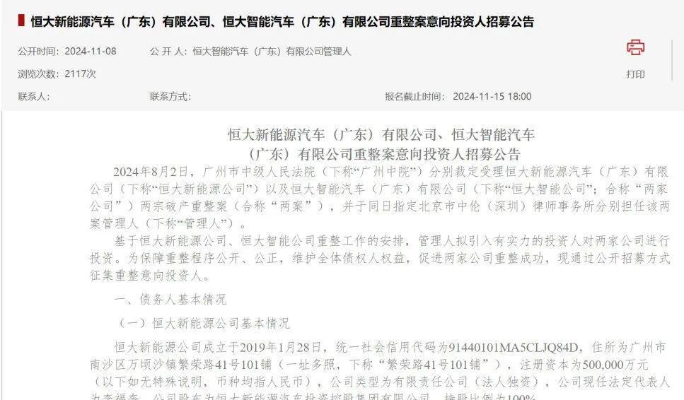 期间,恒大汽车也“努力”过,想通过招募重整案意向投资人自救。
