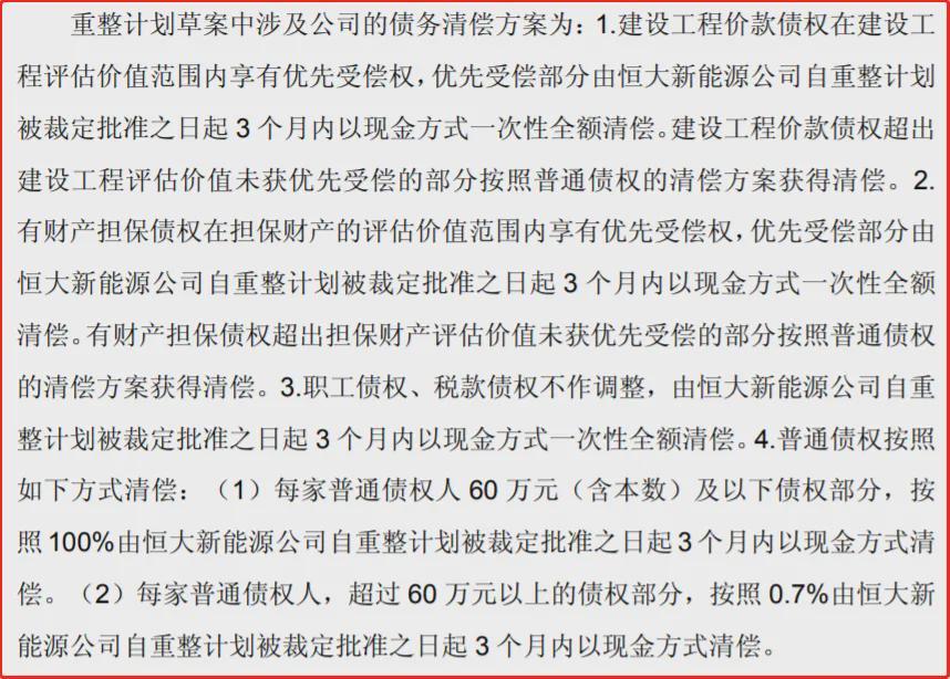 4.普通债权按照如下方式清偿:(1)每家普通债权人60万元(含本数)及以下债权部分,3个月内以现金方式100%清偿。(2)每家普通债权人,超过60万元以上的债权部分,3个月内按照0.7%以现金方式清偿。