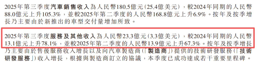 财报显示,2025年第三季度,小鹏的“服务及其他收入”为人民币23.3亿元,较2024年同期的人民币13.1亿元增长78.1%,较2025年第二季度的人民币13.9亿元增长67.3%。