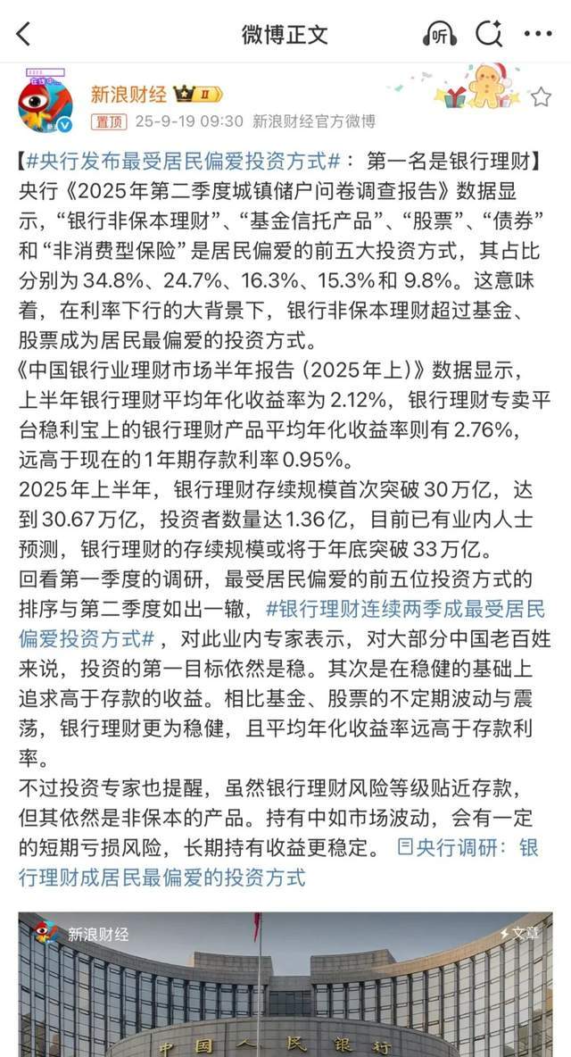 央行数据显示,2025年前三季度人民币存款增加22.71万亿元,即便股市热度回升,对习惯了“存钱避险”的父母辈来说,存款仍是不可替代的“安全区”。三季度城镇储户问卷更直接点明市场偏好:仅18.5%的居民倾向增加投资,而在具体投资品选择上,银行理财以36%的占比稳居首位,受欢迎度是股票(17.2%)的两倍多,基金则以26.4%位列第二。这些数据背后,是每个家庭里具体成员的选择与磨合。