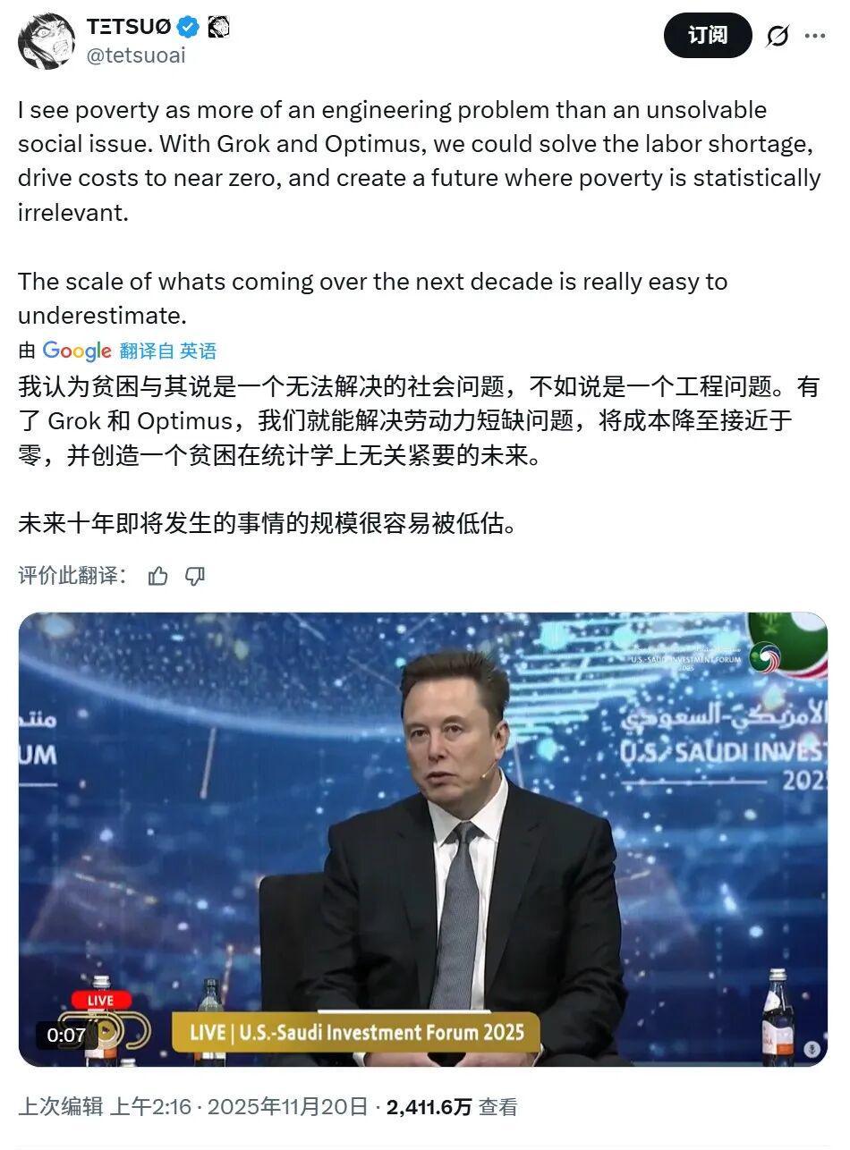 马斯克在论坛演讲中强调,AI与机器人的普及需建立在"对真理和美的追求"基础上,这一前提条件直指技术伦理核心。他随后在社交平台X补充说明,其所说的贫困消除特指绝对贫困(如缺乏基本生存资源),而非心理层面的相对贫困感。"贫富差距可能永远存在,但技术将确保每个人获得超乎想象的医疗保障和娱乐体验。"
