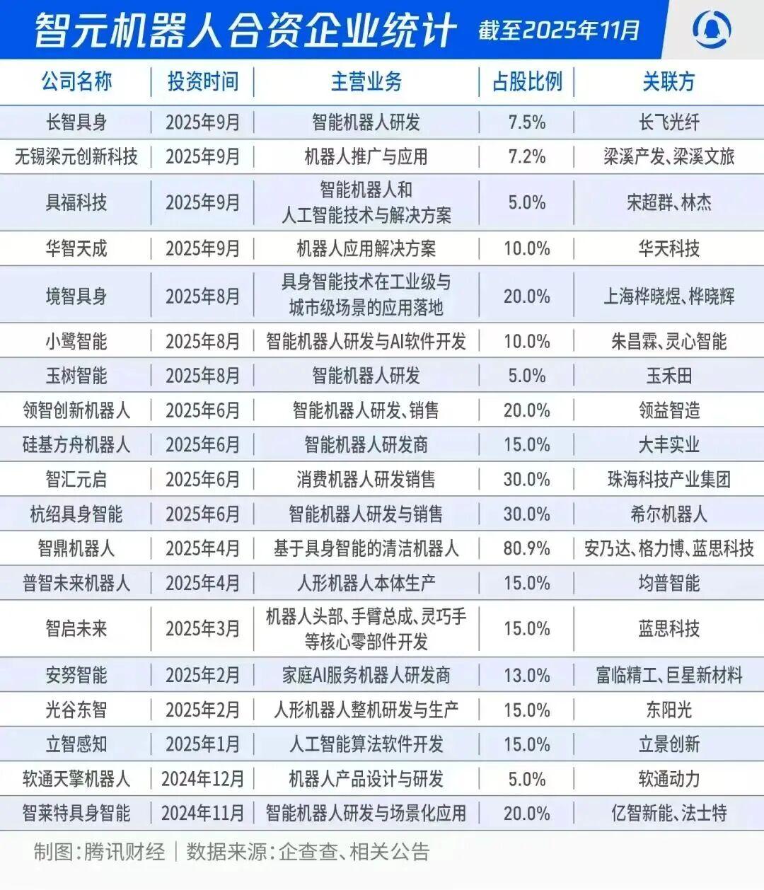 与宇树不同,智元选择通过收购上纬新材实现A股曲线上市,创造股价15倍涨幅的资本神话。企查查数据显示,其一年内投资近30家创企,覆盖电机、AI大脑、场景落地等产业链关键环节,并与高瓴设立数亿元产业基金,启动"智元A计划"孵化超50个早期项目。