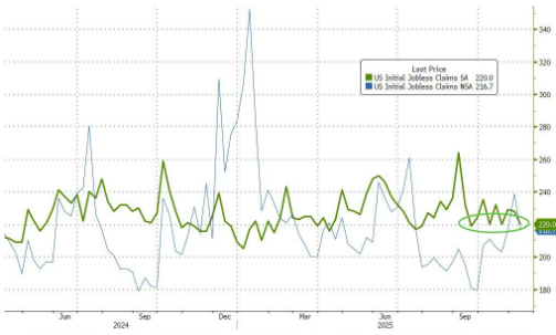 此外,上周美国首次申请失业救济人数下降至22万,显示尽管经济存在不确定性,雇主整体仍在保留现有员工。截至11月15日当周,初请人数减少8000人。根据劳工部周四发布的数据,上周续请失业救济的人数上升至197万人。尽管近期包括亚马逊和Target在内的多家大型企业宣布裁员,但失业金申请人数迄今仍相对温和。四周均值也略有下降至224250人。这份报告也是自美国联邦政府因停摆而暂停数据报告长达43天之后,首次发布的关于全国范围内的失业金情况的官方报告。