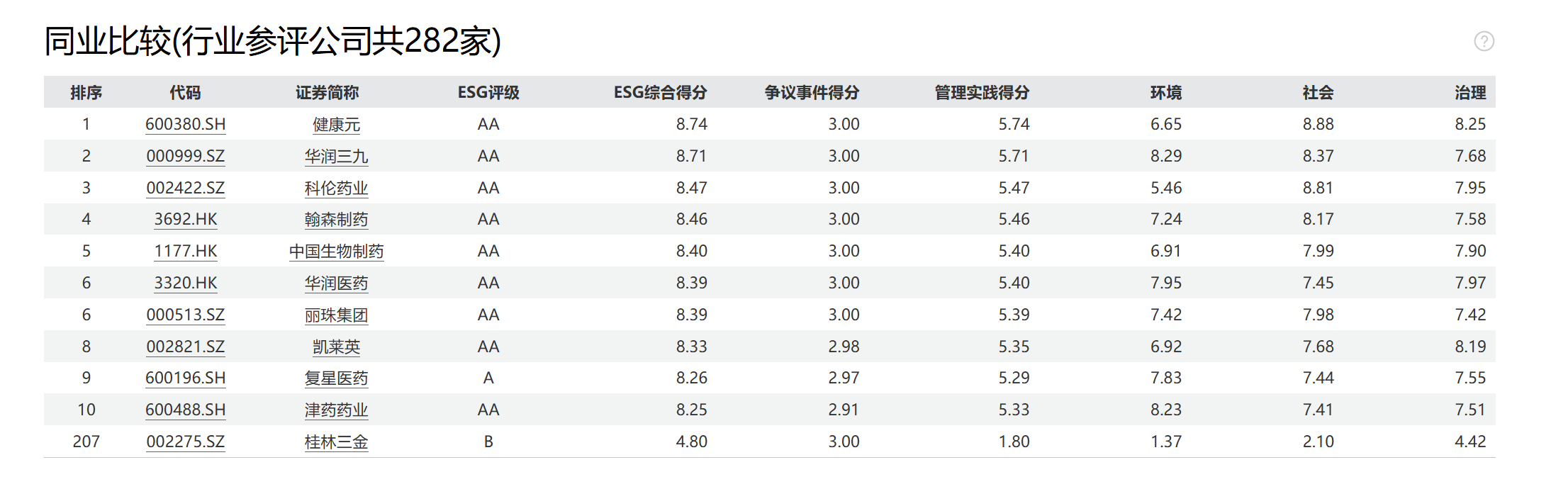 在ESG(环境、社会及治理)领域,桂林三金的表现同样备受争议。根据万得评级系统,桂林三金的ESG评级为B,处于行业下游水平,凸显其在可持续发展方面的短板。