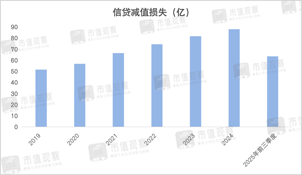 近年来,长沙银行的信贷减值损失持续攀升,自2019年至2024年间从51.67亿元增长到88.05亿元,持续高于净利润。2025年前三季度计提了63.58亿元,虽然同比下降1.78%,但依旧维持在较高水平。