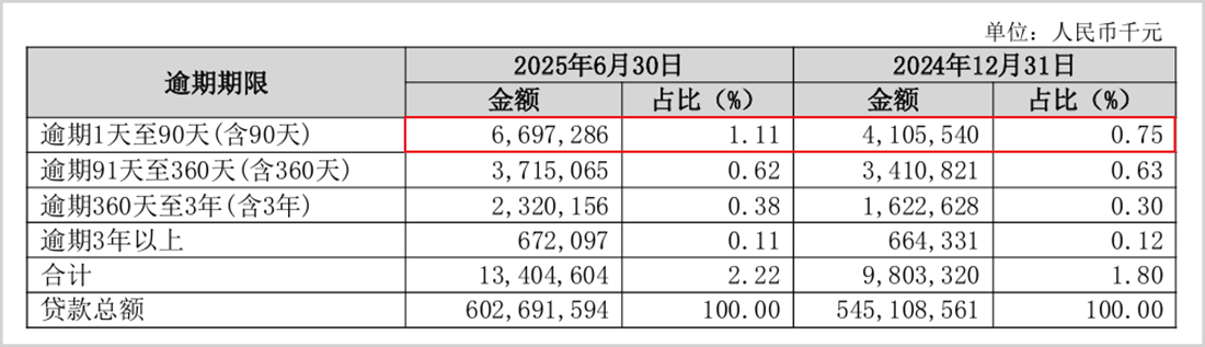 其中,长沙银行1天至90天的逾期贷款增长最快,从2024年底的41.06亿元增长到上半年的66.97亿元,说明该行短期内的资产质量压力仍在加大。