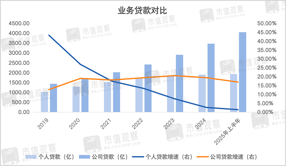 在零售业务疲软之下长沙银行提出了公司业务转型工程,位居2024年至2026年的十大重点工程之首。可以看出近年来该行的对公信贷成为了拉动贷款增长的主力军,自2020年以来增速一直在15%以上,上半年共投放了4049.24亿元,占贷款规模比重达67.19%。