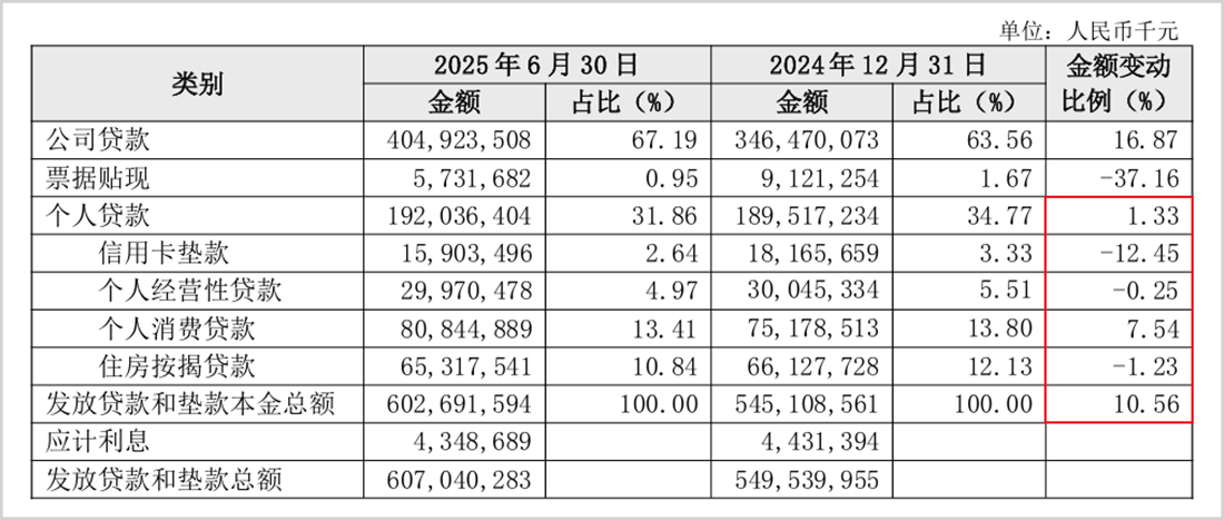 在零售战略的驱动之下,长沙银行的零售贷款规模快速增长,2019年增速达43.24%,此后便不断滑落,到2025年上半年仅增长了1.33%至1920.36亿元,期间贷款占比也由39.18%降至31.86%。