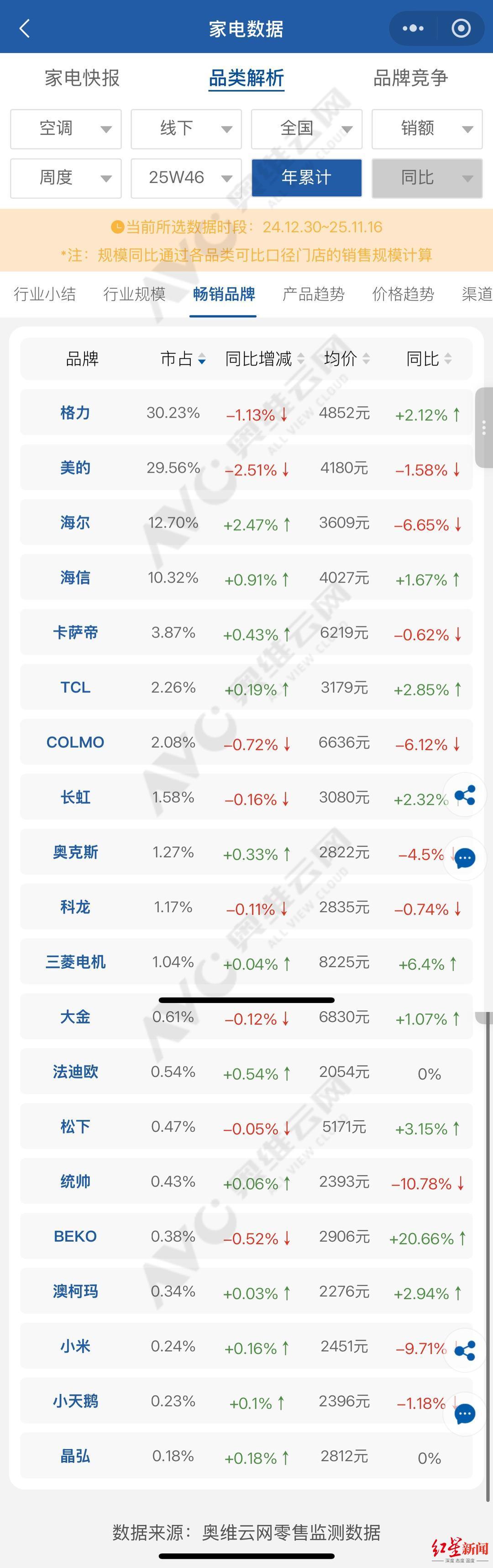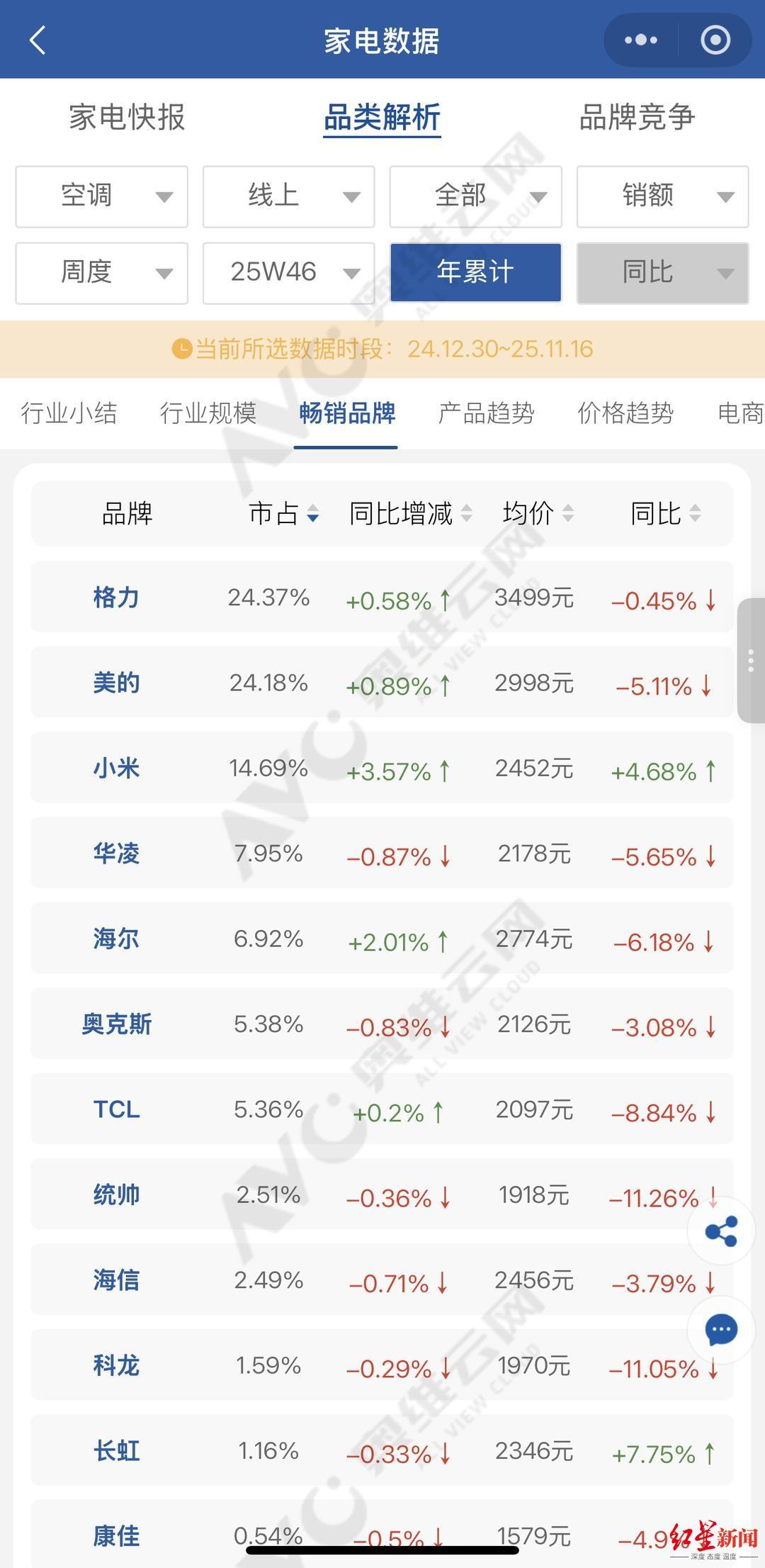 据奥维云网小程序数据,截至2025年11月16日,在线上空调畅销品牌中,小米市场占有率为14.69%,排名第三,仅次于格力和美的;值得注意的是,在前三名中,只有小米空调的均价同比上升了4.68%,达到2452元。