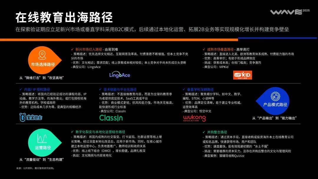 通过分析过去在线教育企业的出海路径,我们发现,从市场选择上看,在线教育出海企业多以新兴市场为切口走“降维打击”路线,以及在成熟市场走攻坚路线;从产品和运营角度看,在线教育的出海路径可以总结为以优势产品垂直切入,靠深度本地化扎根生长。比如今天来到我们大会的伴鱼PalFish,它以少儿英语起家,2023年开始战略性布局海外线下门店,目前已经在海外开了14家学习中心,至今海外业务年均增长率超过150%,成为企业的第二增长曲线。