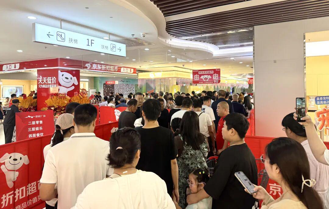 优质低价策略使京东折扣超市每进一城均引发消费热潮。从涿州到宿迁,新店开业当天商场客流量达平时周末的3-4倍,超市入口扶梯全天满负荷运转。为保障运营秩序,每家门店均实施限流措施,火爆场景持续至深夜闭店。