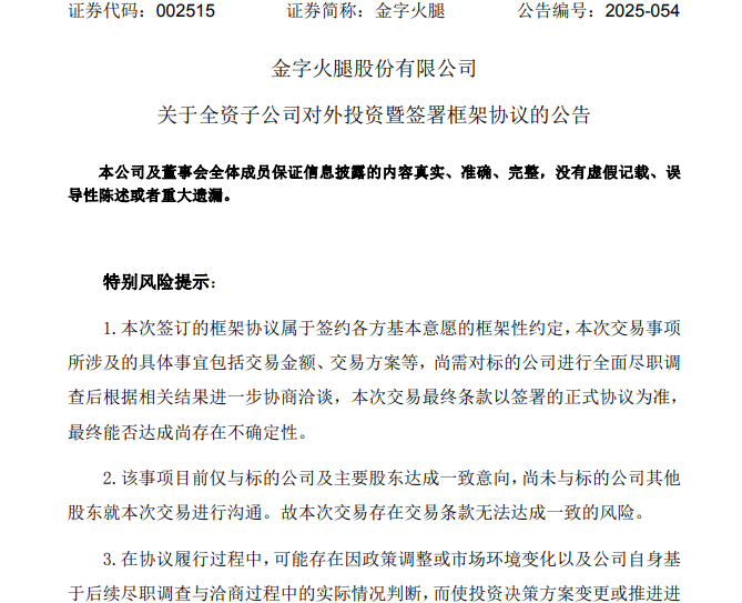 这场交易目前仅停留在框架协议阶段,双方尚未签署具有法律约束力的正式文件。但金字火腿的急切态度折射出其对主业增长乏力的焦虑——受行业需求疲软影响,2025年上半年公司净利润同比下降25%,火腿产销双降的困境亟待破解。