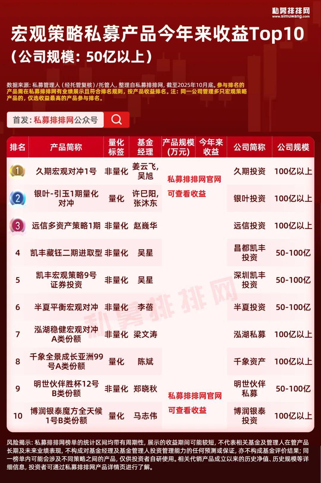 今年前10月收益位居前3的宏观策略产品依次来自:久期投资、银叶投资、远信投资,3家均为百亿私募。