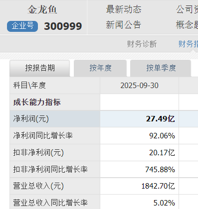 作为“粮油一哥”,金龙鱼2025年前三季度的业绩表现却十分亮眼。数据显示,2025年前三季度,公司业绩大幅回暖,实现营业收入1842.70亿元,同比增长5.02%;归母净利润为27.49亿元,同比增长92.06%;扣非归母净利润为20.17亿元,同比增长745.88%。