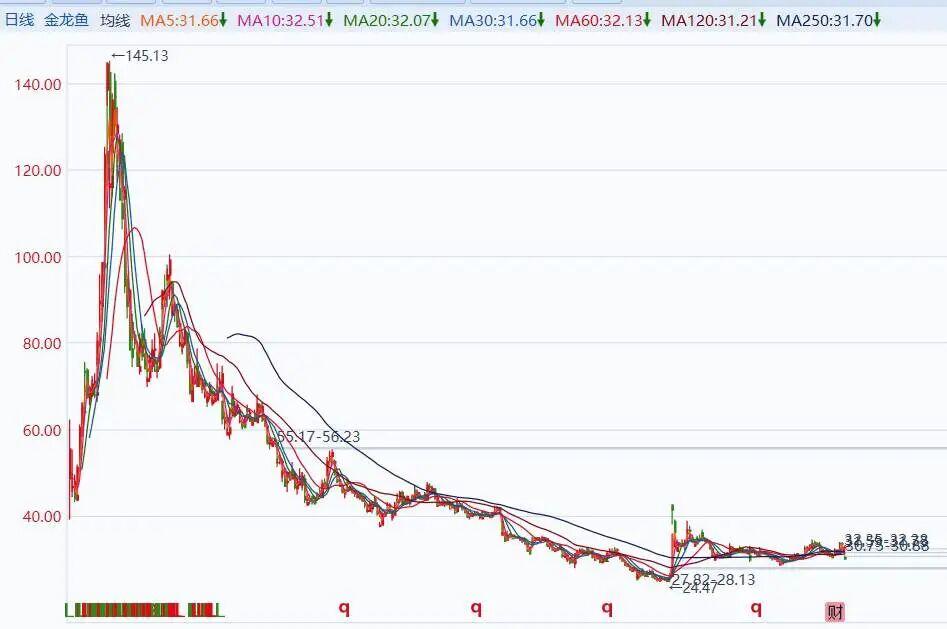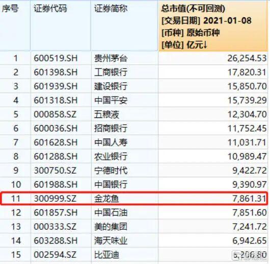 2020年,金龙鱼登陆创业板,当年创造了创业板最大IPO纪录,并且在短短3个月之内大涨450%,市值最高超7800亿元,冲进A股总市值排行榜第11名。不过,2021年1月股价达到最高点后,金龙鱼股价开启了慢慢跌途,如今市值相比于巅峰时期大跌79%,市值蒸发约6200亿元左右。