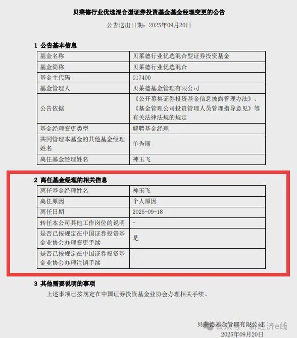 9月20日,贝莱德基金发布公告称,旗下基金经理神玉飞因个人原因宣布离任,且将不再在公司转任其他职位。神玉飞拥有丰富的从业经验,曾担任银河基金宏观策略研究员、行业研究员、基金经理助理及基金经理等职务,并于2023年加入贝莱德基金。同年3月,他开始管理贝莱德行业优选,2024年1月起管理贝莱德中国新视野。离任前,他还担任了贝莱德基金首席权益投资官一职。