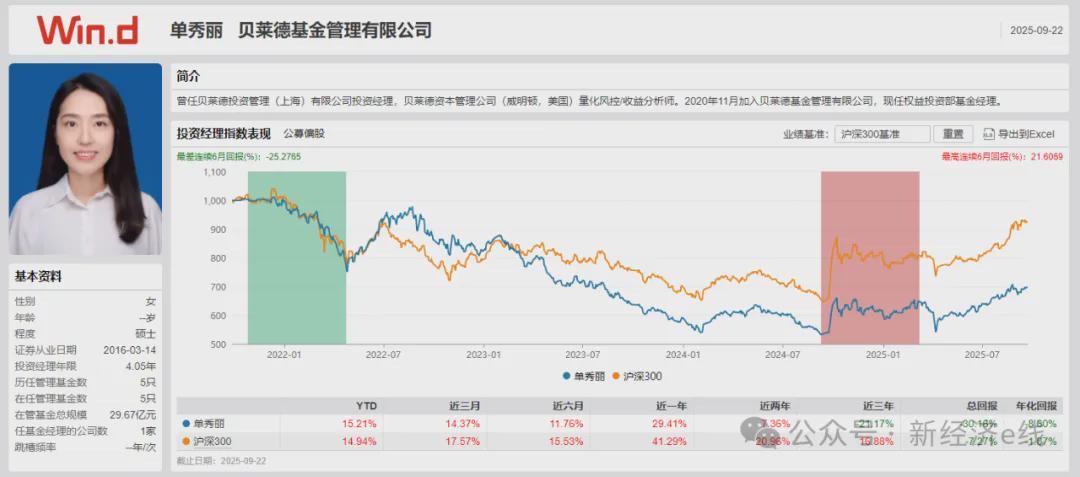 新经济e线获悉,若考察其任职回报,作为继任者的单秀丽却并不能让基金持有人满意。根据Wind投资经理指数表现,截至2025年9月22日,单秀丽的任职总回报为负,低至-30.16%,年化回报-8.60%。