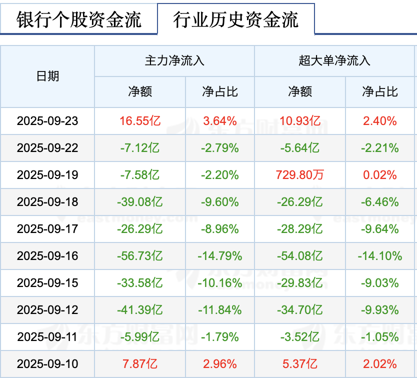 从今日银行板块交投情况来看,东方财富数据显示,银行板块当日成交额达455.1亿元,较昨日的254.89亿元大幅提升。其中,工商银行、农业银行、中国银行、建设银行分别获主力净流入5.60亿元、2.43亿元、2.46亿元、1.67亿元。今日银行板块合计获主力净流入16.55亿元,是继9月10日之后首次获主力净流入。