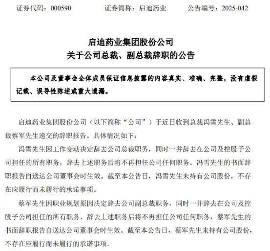 9月23日,启迪药业发布公告称,公司总裁冯雪因工作变动辞去职务,副总裁蔡军因职业规划原因辞去职务,二人均不再担任公司任何职务。这一变动标志着公司高层架构的进一步调整。