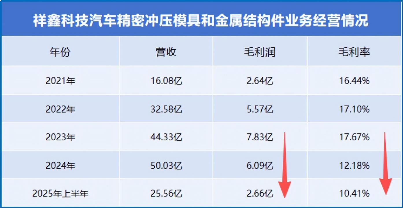 祥鑫科技净利润下滑的直接原因,在于主业毛利率持续走低:汽车精密冲压模具业务毛利率从2024年开始下滑,2025年上半年已降至10.41%。这背后是行业恶性竞争与车企客户资金压力的双重挤压——零部件厂商利润空间被压缩,回款周期延长。