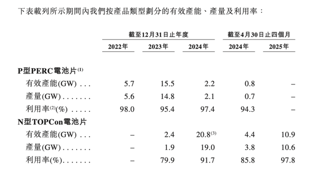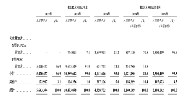 英发睿能迅速跟上了这场转型,且决心和速度惊人。《招股书》数据显示,英发睿能的P型PERC电池片产线利用率从2024年的97.4%骤降至2025年前四个月的0,已完全停产;与此同时,N型TOPCon电池片的产线利用率则从2023年的79.9%飙升至2025年前四个月的97.8%,成为绝对的生产主力。2023年至2025年前四个月,其收入分别为7.44亿元、35.4亿元及23亿元,收入占比由7.1%猛增至95.5%。