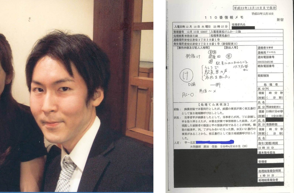 当他准备爬上JR新宿站的楼梯时,从他身边经过的一名女大学生说了一句“有人摸我的肚子”,随后被两名男大学生误以为猥亵,遭受了殴打。