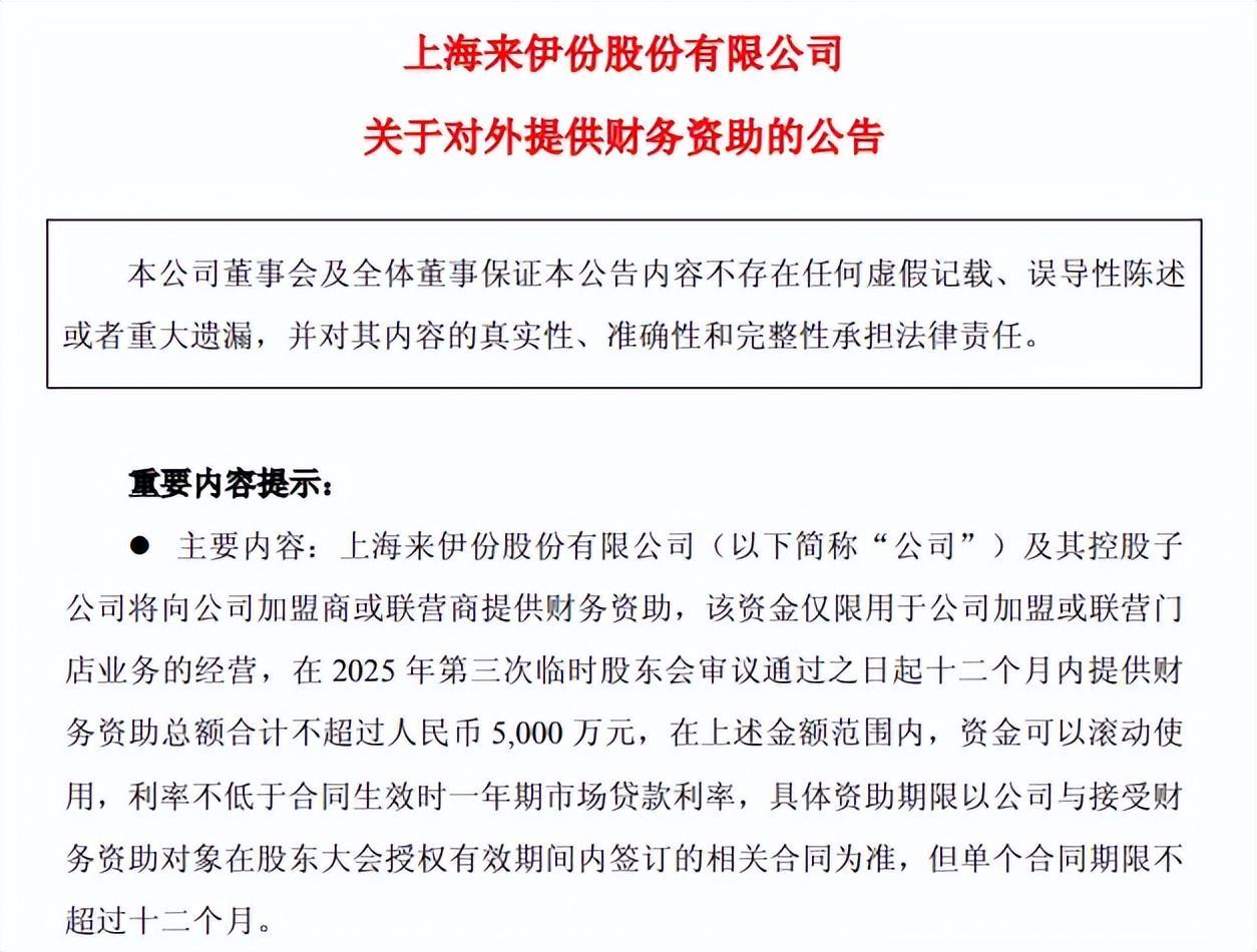 公告中,施永雷措辞谨慎。他指出,本次接受财务资助的对象中可能包含资产负债率超过70%的个人加盟商或联营商,因此这项对外财务资助事项还需提交公司股东会审议。